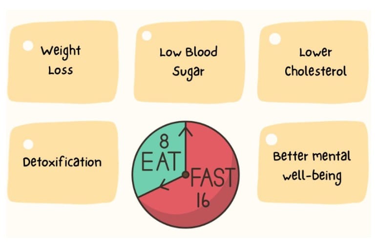 - 16/8 Method: Fast for 16 hours and eat within an 8-hour window (e.g., eating from noon to 8 PM).